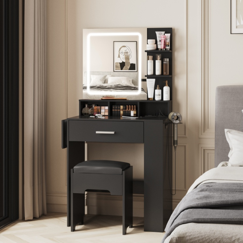 Elegant Hardwood Dressing Table with Mirror, Lighting, and Charging Station for Bedroom Organization