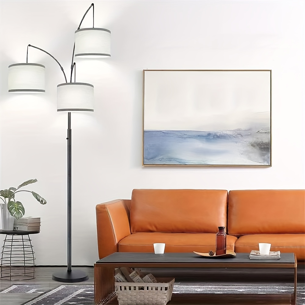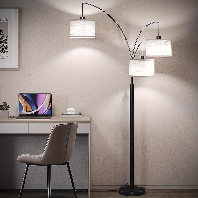 3-Light Modern LED Floor Lamp with Adjustable Arc Arms & Hanging Drum Shades - Black Metal Standing Light